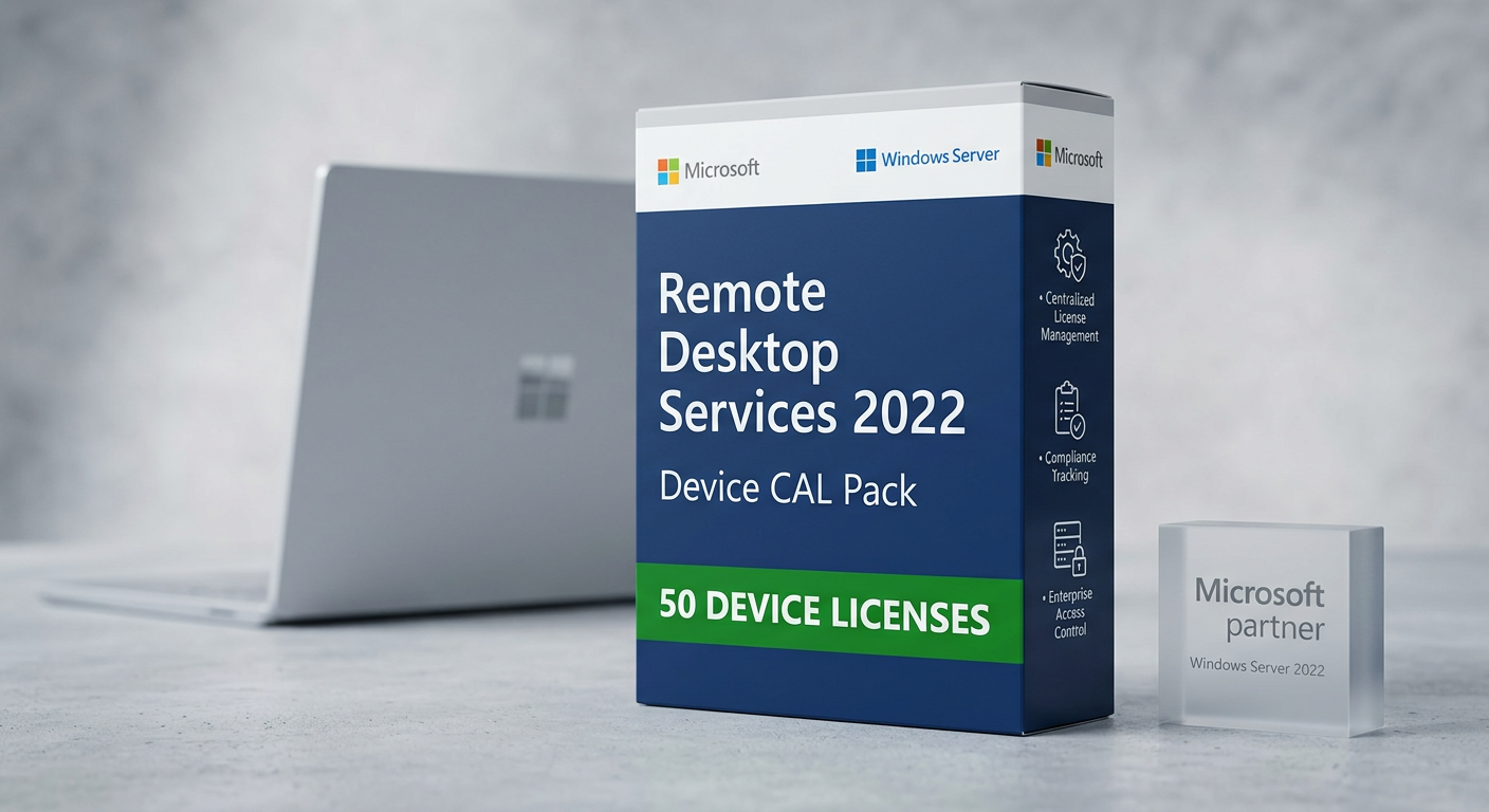 The Windows Server 2022 RDS 50 Device CAL pack provides Remote Desktop Services Client Access Licenses for 50 devices to connect via Remote Desktop regardless of user. Remote Desktop Services (RDS) CALs are required in addition to standard Windows Server CALs when users or devices connect to a Windows Server via Remote Desktop for full desktop sessions, RemoteApp published applications, or VDI (Virtual Desktop Infrastructure). Without RDS CALs, Remote Desktop connections are limited to two concurrent administrative sessions per server. RDS CALs unlock the full Remote Desktop Session Host functionality, enabling multiple users to connect simultaneously to a shared server desktop or individual published applications. This is the foundation of thin-client computing, terminal server deployments, and centralized application hosting — where applications run on the server and only the display, keyboard, and mouse signals travel across the network. For organizations with remote workers, branch offices, or BYOD policies, RDS provides a secure way to deliver corporate applications without installing software on end-user devices. All data stays on the server, reducing the risk of data loss from stolen or compromised laptops. This 50-pack provides Device CALs specifically for Windows Server 2022 with downward compatibility to older versions. RDS CALs are required in addition to — not instead of — standard Windows Server CALs. Each connecting user or device needs both a Windows Server CAL and an RDS CAL. RDS Device CALs are perpetual and do not expire. They support all RDS deployment scenarios including session-based desktops, RemoteApp programs, VDI personal desktops, and VDI pooled desktops. The licenses cover connections through Remote Desktop Gateway, Remote Desktop Web Access, and direct RDP connections.