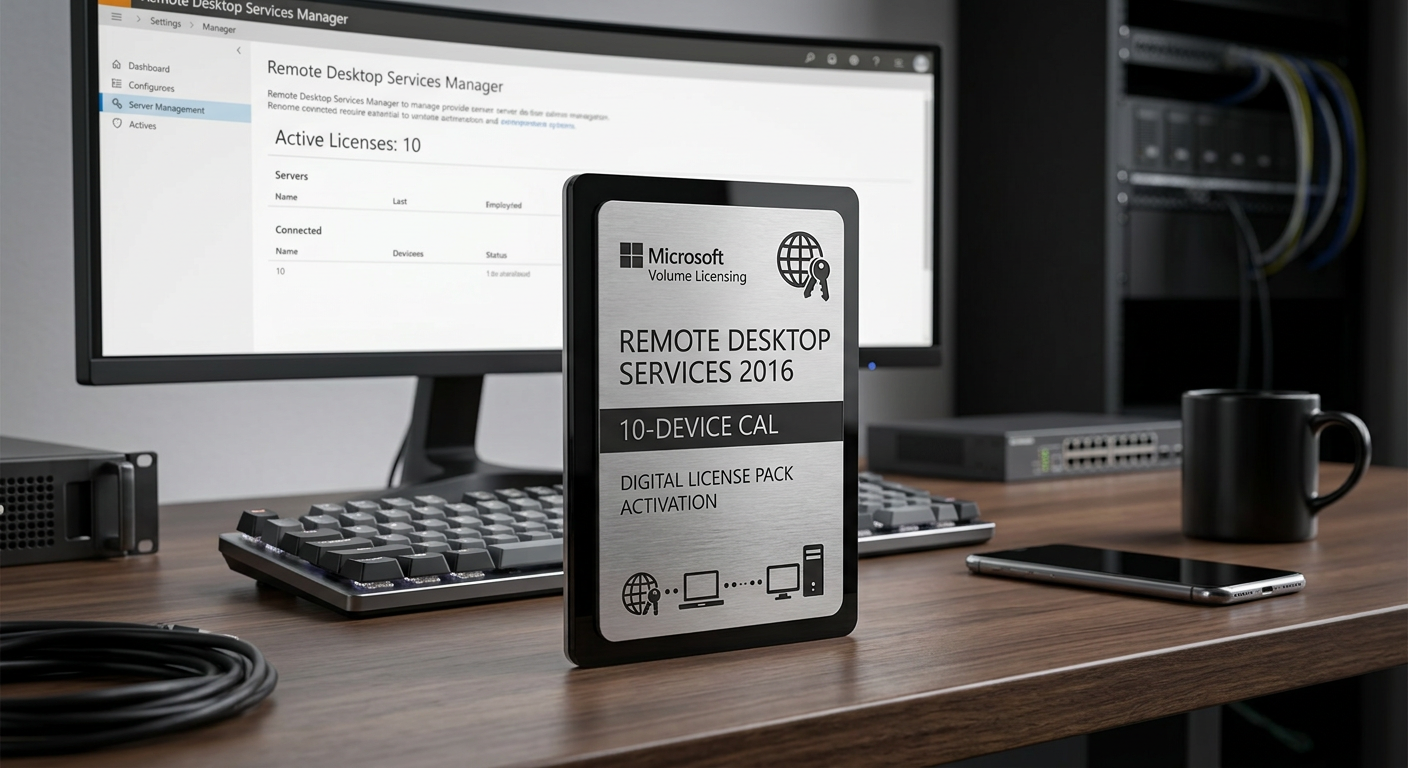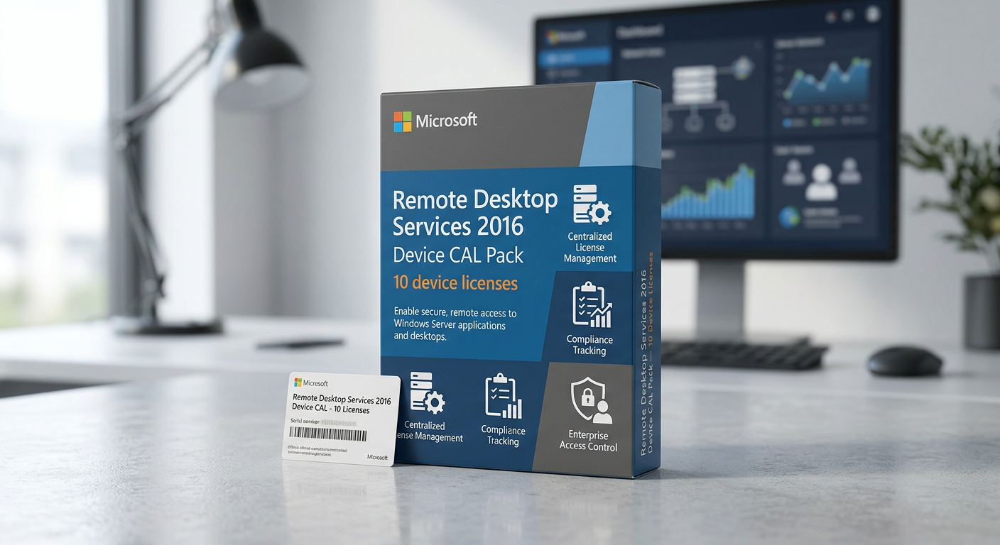 The Windows Server 2016 RDS 10 Device CAL pack provides Remote Desktop Services Client Access Licenses for 10 devices to connect via Remote Desktop regardless of user. Remote Desktop Services (RDS) CALs are required in addition to standard Windows Server CALs when users or devices connect to a Windows Server via Remote Desktop for full desktop sessions, RemoteApp published applications, or VDI (Virtual Desktop Infrastructure). Without RDS CALs, Remote Desktop connections are limited to two concurrent administrative sessions per server. RDS CALs unlock the full Remote Desktop Session Host functionality, enabling multiple users to connect simultaneously to a shared server desktop or individual published applications. This is the foundation of thin-client computing, terminal server deployments, and centralized application hosting — where applications run on the server and only the display, keyboard, and mouse signals travel across the network. For organizations with remote workers, branch offices, or BYOD policies, RDS provides a secure way to deliver corporate applications without installing software on end-user devices. All data stays on the server, reducing the risk of data loss from stolen or compromised laptops. This 10-pack provides Device CALs specifically for Windows Server 2016 with downward compatibility to older versions. RDS CALs are required in addition to — not instead of — standard Windows Server CALs. Each connecting user or device needs both a Windows Server CAL and an RDS CAL. RDS Device CALs are perpetual and do not expire. They support all RDS deployment scenarios including session-based desktops, RemoteApp programs, VDI personal desktops, and VDI pooled desktops. The licenses cover connections through Remote Desktop Gateway, Remote Desktop Web Access, and direct RDP connections.